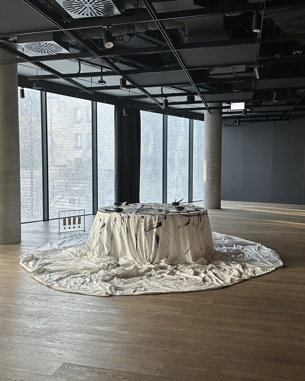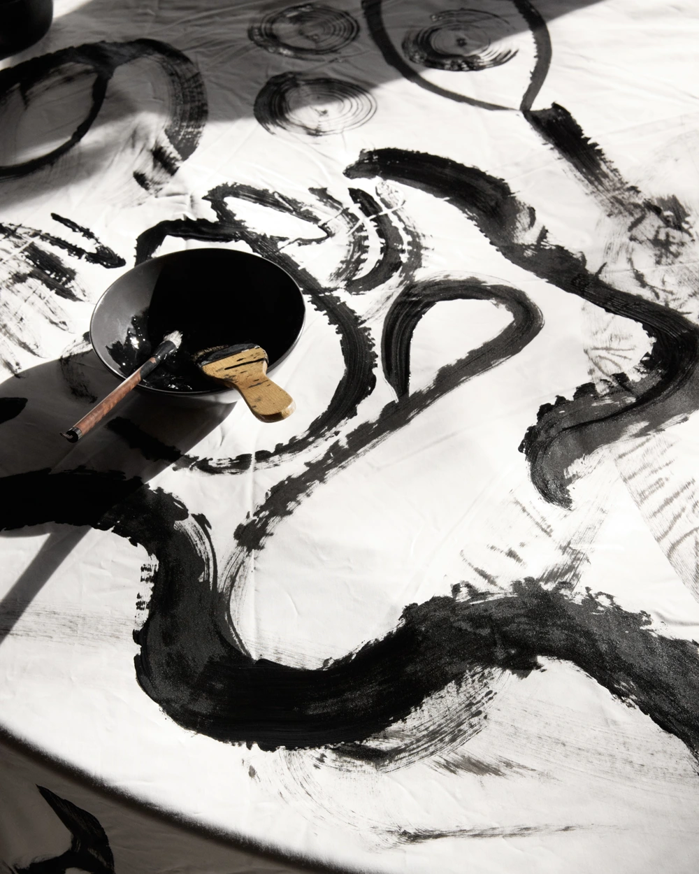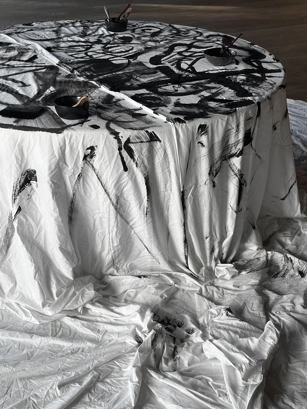 Wokół okrągłego stołu wydarzyło się spotkanie — performance, który opowiadał o wspólnocie, relacjach i tworzeniu razem. Stół, bez kątów i granic, stał się miejscem otwartym dla wszystkich — symbolem jedności i połączenia. Wszystko zaczęło się od dźwięków dzwonków Koshi – czterech żywiołów: wody, ognia, powietrza i ziemi. Ich delikatne brzmienie wprowadziło atmosferę skupienia, spokoju i uważności. Na białych tkaninach z recyklingu, obrusach z hotelu Nobu, Mat rozpoczął malowanie czarnym tuszem – pierwsze abstrakcyjne gesty były jak zapis oddechu, intuicji i emocji. Potem zaprosił wszystkich do wspólnego działania. Wspólnie powstała praca – mapa spotkania, wspólny obrus, zapis chwil, gestów i relacji. Obraz bez autora, dzieło stworzone razem, z potrzeby bycia blisko i tworzenia w jedności.
