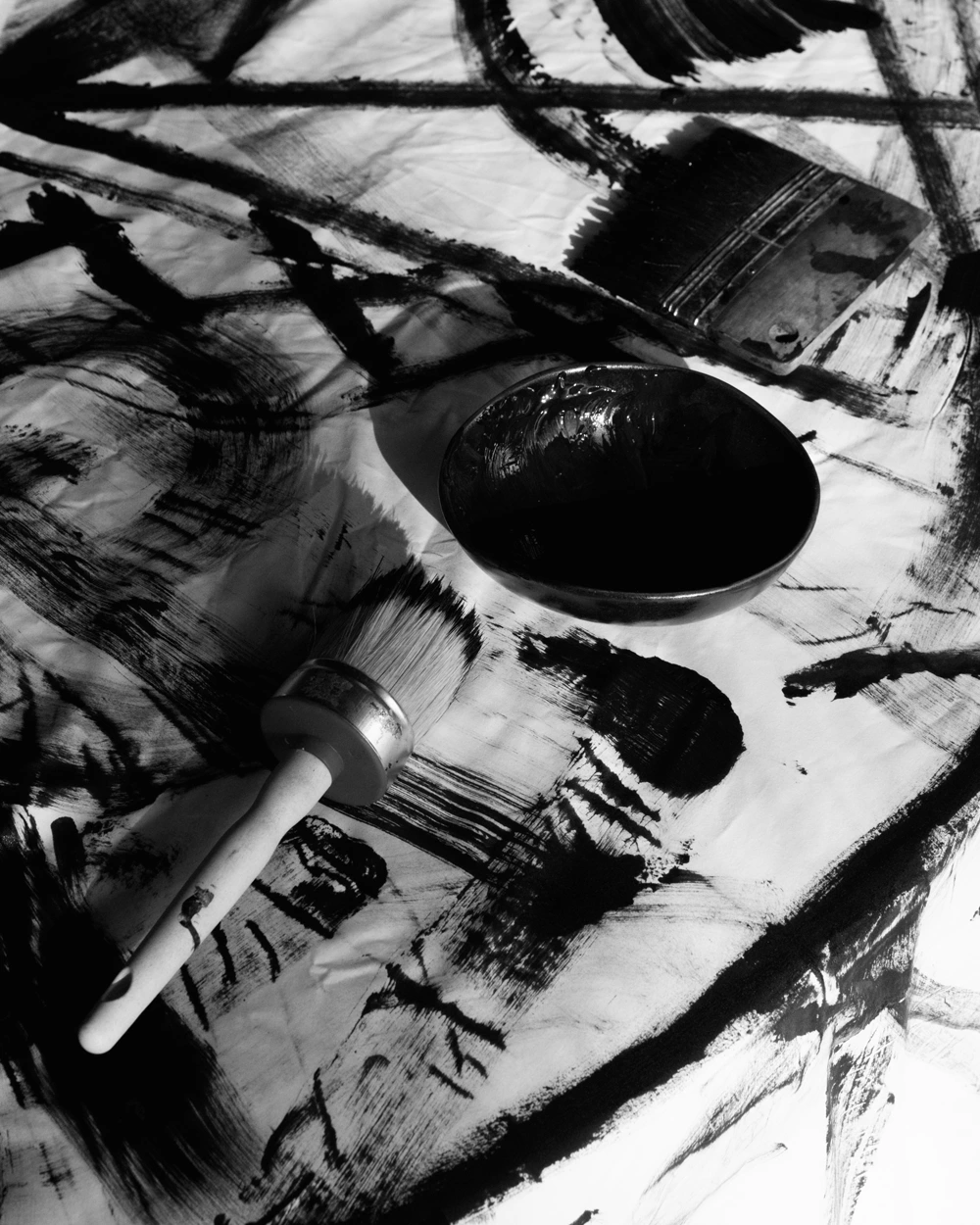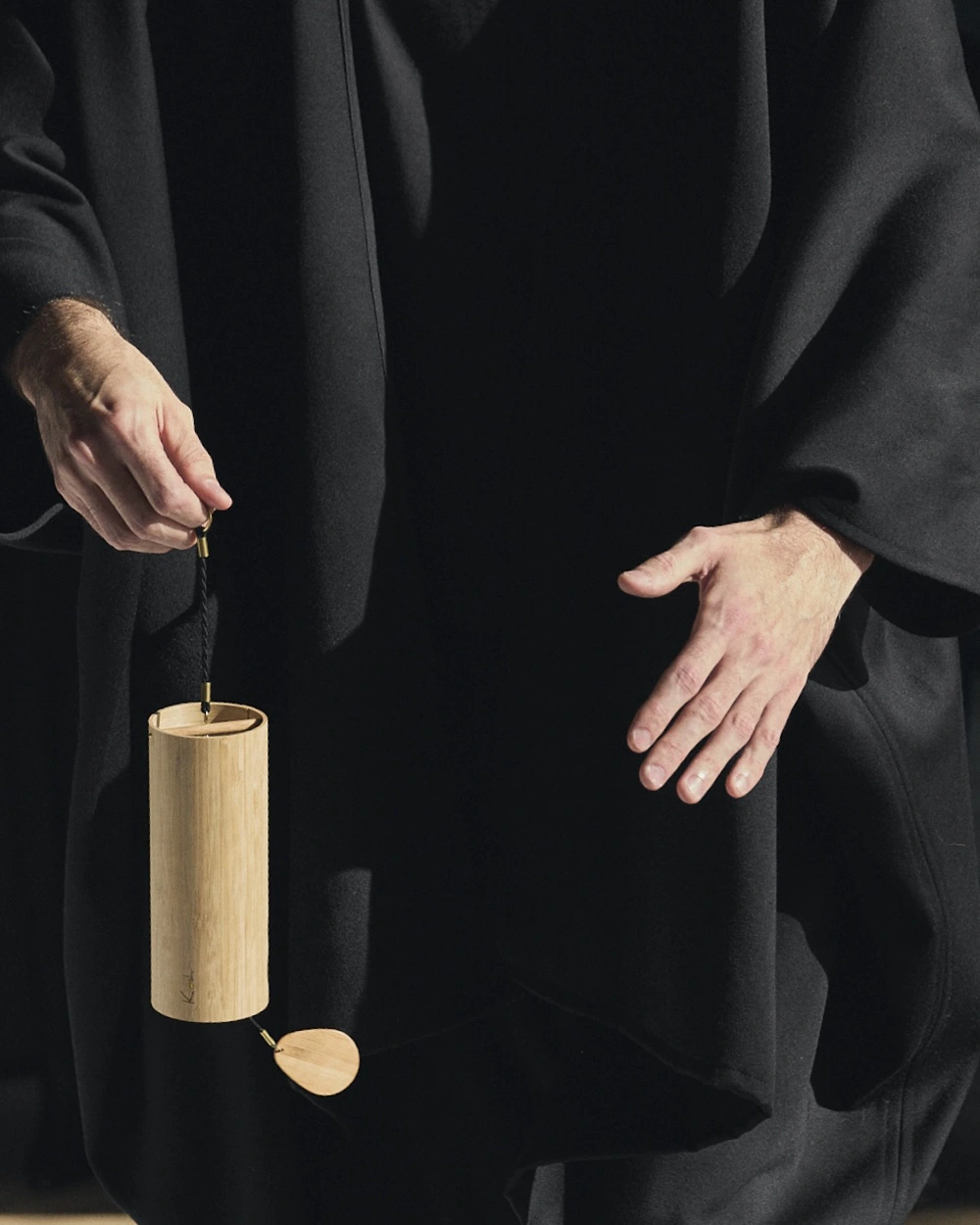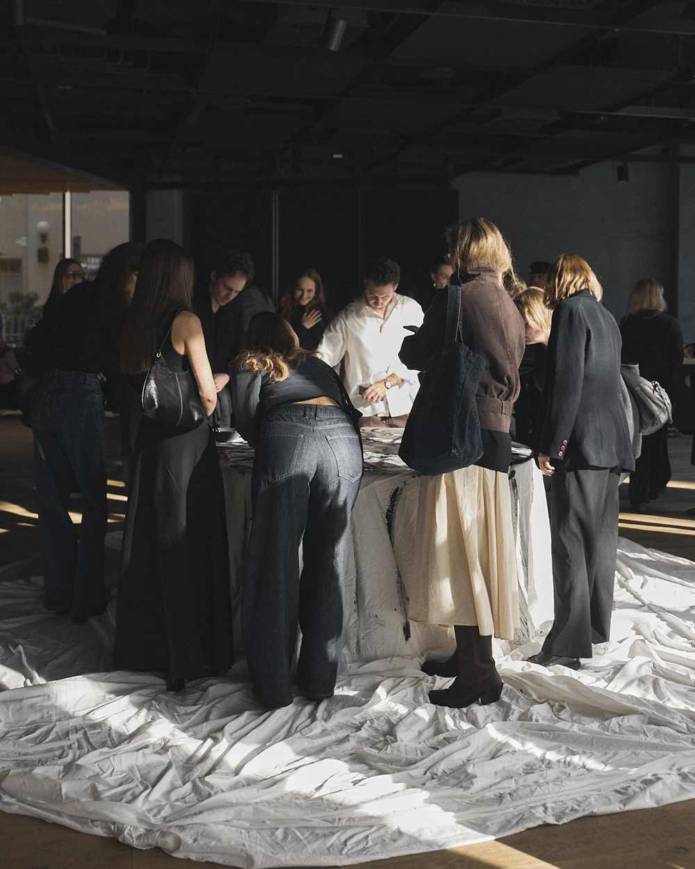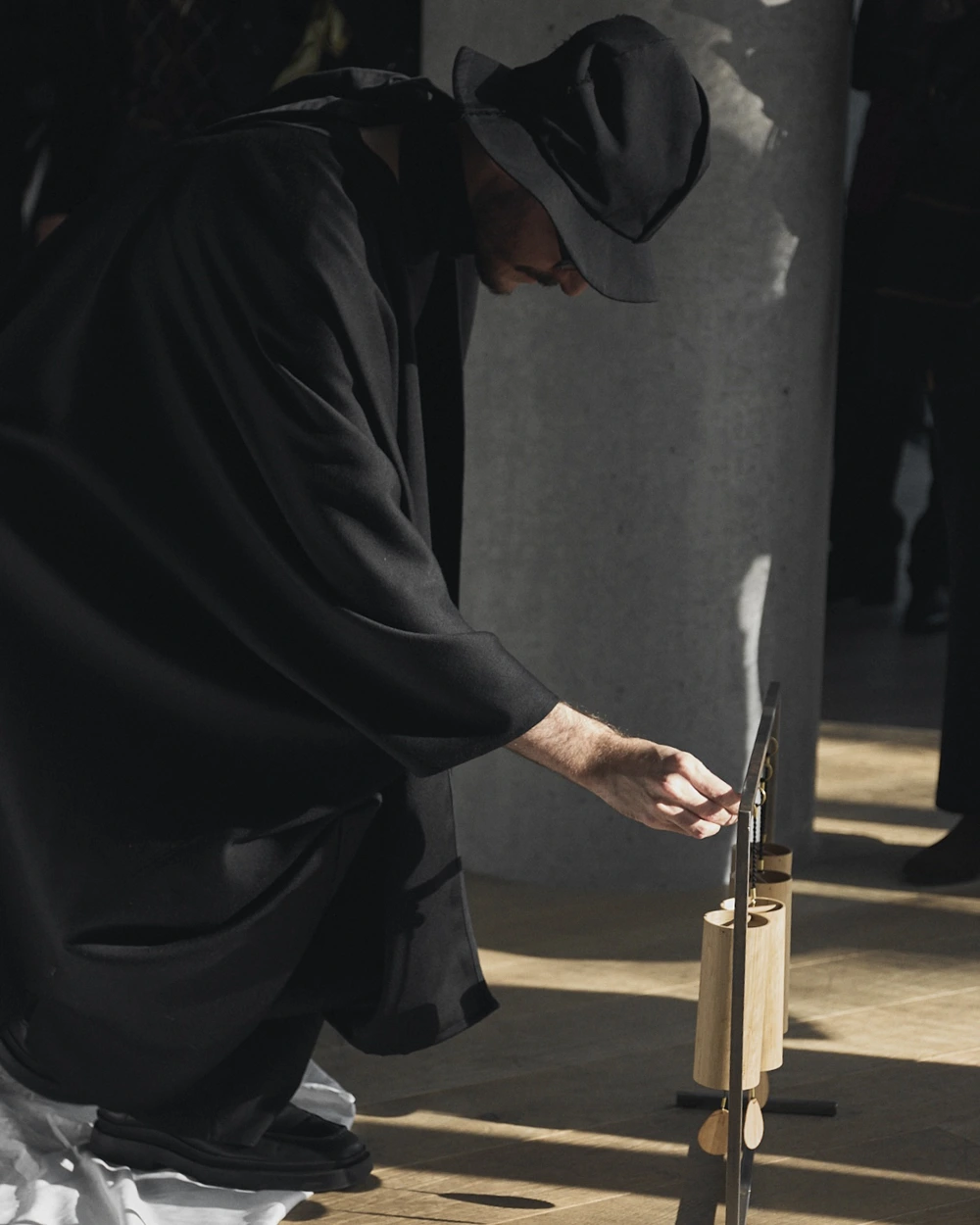 Wokół okrągłego stołu wydarzyło się spotkanie — performance, który opowiadał o wspólnocie, relacjach i tworzeniu razem. Stół, bez kątów i granic, stał się miejscem otwartym dla wszystkich — symbolem jedności i połączenia. Wszystko zaczęło się od dźwięków dzwonków Koshi – czterech żywiołów: wody, ognia, powietrza i ziemi. Ich delikatne brzmienie wprowadziło atmosferę skupienia, spokoju i uważności. Na białych tkaninach z recyklingu, obrusach z hotelu Nobu, Mat rozpoczął malowanie czarnym tuszem – pierwsze abstrakcyjne gesty były jak zapis oddechu, intuicji i emocji. Potem zaprosił wszystkich do wspólnego działania. Wspólnie powstała praca – mapa spotkania, wspólny obrus, zapis chwil, gestów i relacji. Obraz bez autora, dzieło stworzone razem, z potrzeby bycia blisko i tworzenia w jedności.