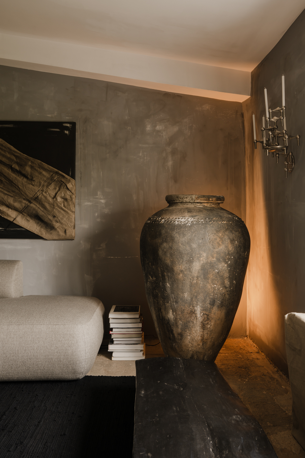 Ściany pracowni pokrywa pięć odcieni szarości, nakładanych warstwowo, przecieranych i przeczesywanych niczym warstwy obrazu. Ich nieregularna faktura buduje głębię, a zestawiona z betonową posadzką tworzy przestrzeń o wyraźnie artystycznym, niekonwencjonalnym charakterze. To tło dla przedmiotów o wyjątkowej tożsamości — obiektów, które łączą w sobie sztukę, materię i historię. Na jednej ze ścian wisi autorska praca Mata Kubaja – obraz wykonany tuszem japońskim i surowym lnem. To kompozycja, w której gest i tekstura przenikają się w subtelnym dialogu, będąca częścią jego eksperymentów z materią i formą.W centrum przestrzeni znajduje się lampa vintage z lat 80., wykonana w Murano według projektu Lino Tagliapietra (model Pyramid Lamp). Jej ciepłe, rozproszone światło łagodzi surowość wnętrza i wprowadza zmysłową miękkość. W sąsiedztwie — rzeźba „MOLT” Karola Wyciska z krakowskiej Galerii Dystans, wykonana z metalu i osadzona na czarnym kamieniu. To dzieło ucieleśnia ideę perfect imperfect – doskonałej niedoskonałości. Forma koła symbolizuje pełnię, enso, cykliczność. Surowa i minimalistyczna, idealnie wpisuje się w przestrzeń, podkreślając jej artystyczny, kontemplacyjny charakter. „Prace Karola często pojawiają się w moich realizacjach” – podkreśla Mat. – „Ta rzeźba w formie koła jest wyjątkowa – zrównoważona, niemal medytacyjna. Artysta tworzy również większe formaty ścienne, które nadają wnętrzom rzeźbiarskiego wyrazu.” Na uwagę zasługuje również ponad 120-letnia gliniana amfora z Indii, odnaleziona dzięki Thymka Studio. Dawniej przechowywała zboże – symbol urodzaju, dobrostanu i obfitości. Dziś, w nowym kontekście, staje się talizmanem domu, przywołującym organiczne piękno i ducha przeszłości. Obok niej stoi czarna drewniana ława „Naga Bed”, wyrzeźbiona z jednego kawałka drewna — monumentalna i prosta, jak rzeźba, z której wyrasta. Kompozycję dopełniają chromowane elementy – stolik o minimalistycznej formie oraz kolekcja modułowych świeczników STOFF Nagel, klasyka designu lat 60.