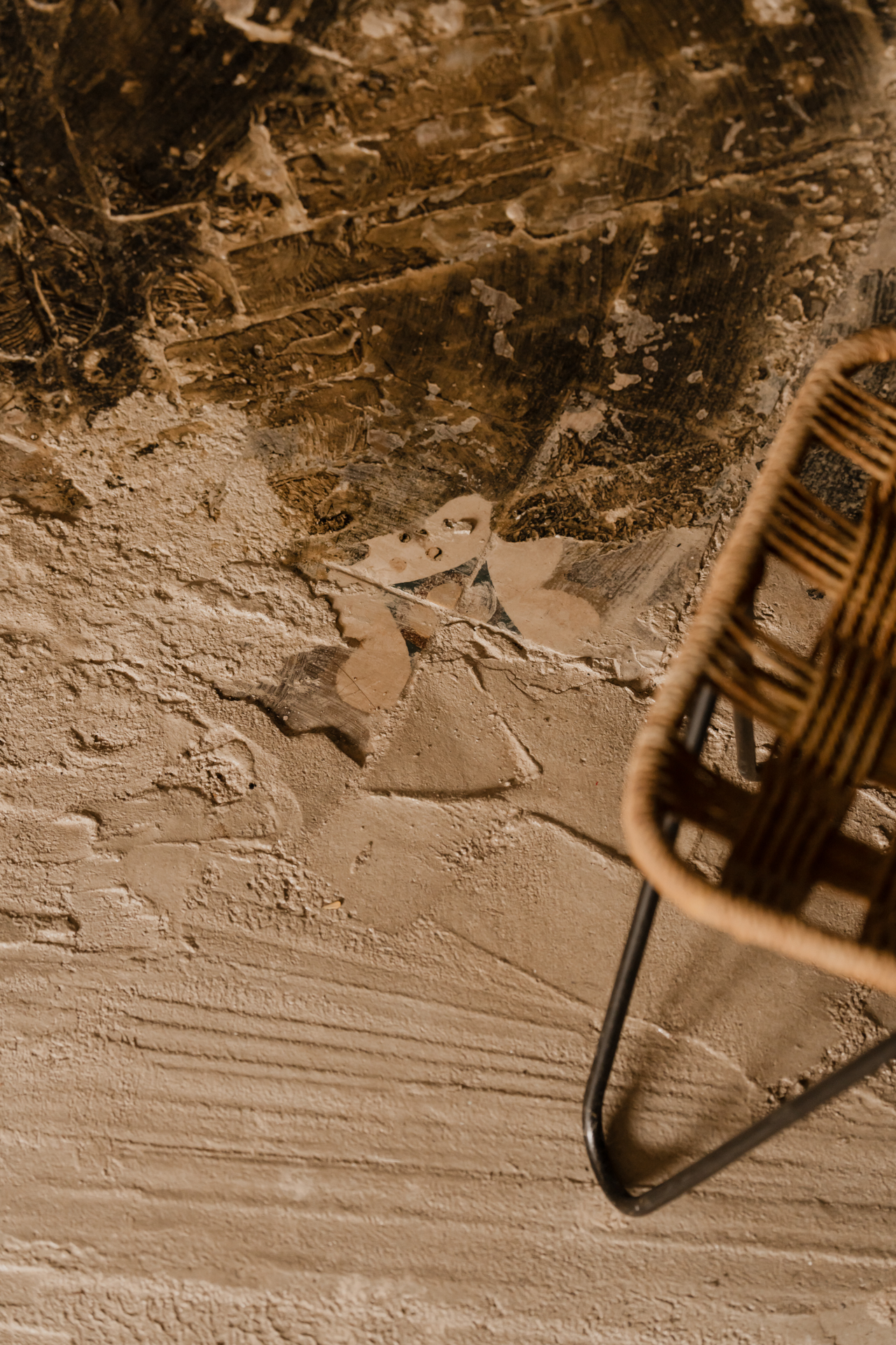 Już po przekroczeniu progu wita nas ponad sześciometrowa tkanina artystyczna, ręcznie malowana tuszem japońskim. Jej rytm i miękka faktura wprowadzają w atmosferę skupienia i spokoju. Pracownia zlokalizowana jest w kamienicy z lat dwudziestych, zachowała ducha swojej epoki. Wysokie, niemal trzymetrowe wnętrze ze skosami otula światło, które miękko ślizga się po chropowatych powierzchniach. Surowa posadzka z betonu, w niektórych miejscach odsłaniająca ślady dawnych warstw, stała się osią całej aranżacji — świadectwem czasu i pamięci miejsca. Po odsłonięciu podłogi ukazała się cała jej historia: od fragmentów przy starym piecu kaflowym, przez cegły ułożone w jodełkę, aż po oryginalne, przedwojenne kafle z lat dwudziestych XX wieku. To odkrycie nabrało szczególnego znaczenia — pracownia mieści się bowiem w modernistycznej kamienicy, w sercu żoliborskiej architektury, w miejscu nasyconym historią warsztatu, rzemiosła i artystycznego ducha. „Zależało mi, by ukazać surowość tej podłogi, jej autentyczną strukturę, ślady czasu i kolejne warstwy historii” — mówi Mat. „Surowość stała się tu nie tylko estetycznym wyborem, ale i sposobem na odsłonięcie pamięci miejsca.”